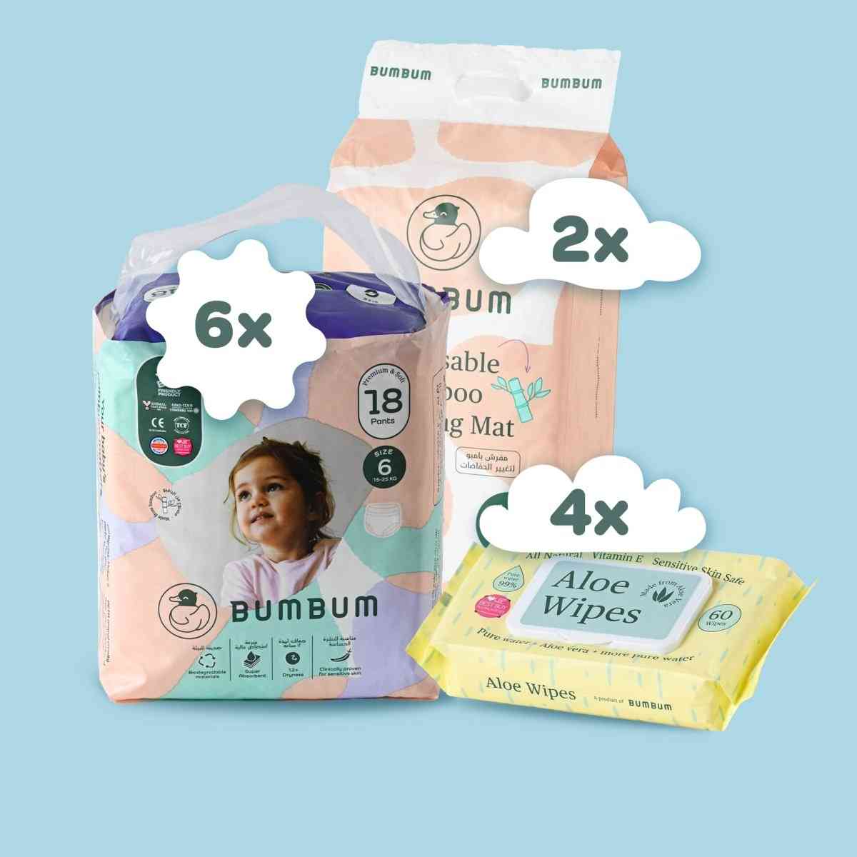 مجموعة مناديل مبللة فائقة النعومة (2+1) مُتكاملة، مصنوعة من ألياف الخيزران العضوية ومُعززة بخلاصة الصبار المُهدئ؛ تحتوي كل عبوة على 120 منديلًا.